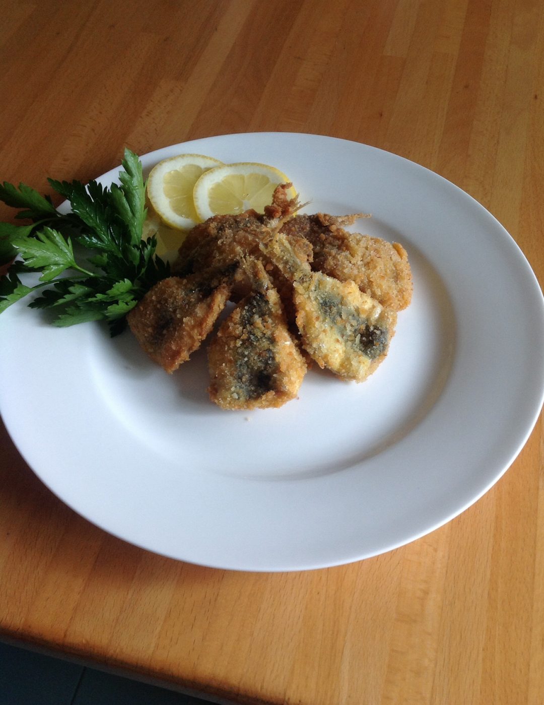 Ecco un ottimo antipasto: sardine fritte. Certo mangiato in riva al mare quando lo prepara il mitico Giorgio dei bagni Mafalda ha tutto un’altro gusto. Ma facciamo entrare un po’ di aria d’estate nelle nostre case.