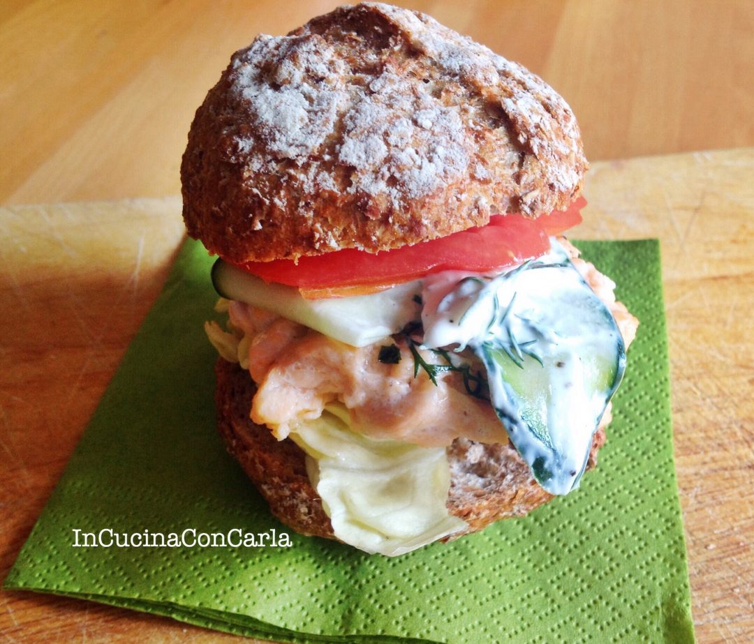 Un classico del fastfood l’hamburgher in una veste un po’ più raffinatamente e fresca: pane integrale, salmone tritato a coltello, condito con finocchietto e prezzemolo, e una farcitura di cetriolo con yogurt greco e pomodoro.