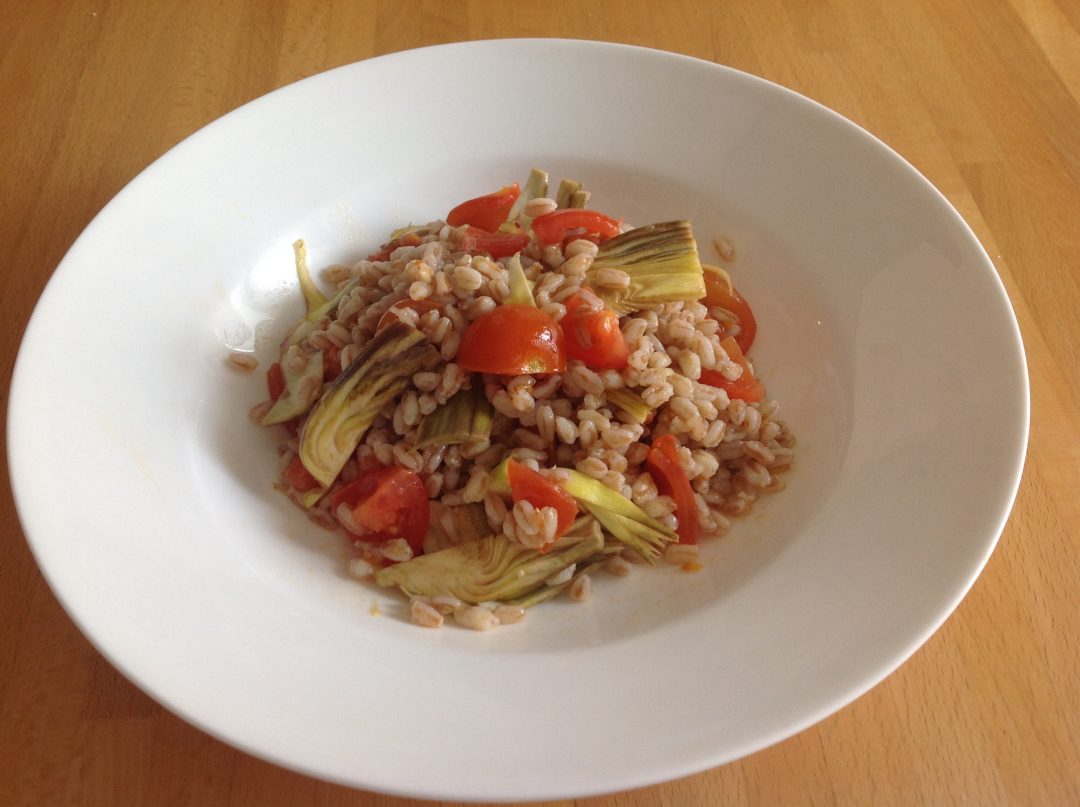 Preparazione ultra veloce. Cuocere il farro per il tempo indicato sulla confezione in abbondante acqua salata, scolarlo e metterlo in una ciotola. Affettare finemente i carciofi e condirli con sale, pepe e un paio di cucchiai d’olio. Tagliare i pomodorini in due ed assemblare il tutto nella ciotola mescolando con un cucchiaio.